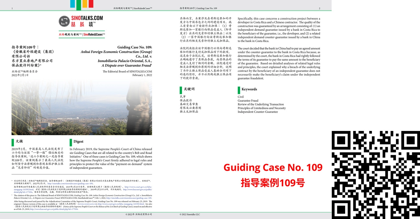 两个指导性案例可以说明这一点。 指导案例109号(《安徽省外经建设(集团)有限公司诉东方置业房地产有限公司保函欺诈纠纷案》)涉及在哥斯达黎加的开发方与中国承包方之间的建设项目。施工质量由按照《国际商会见索即付保函统一规则》出具的见索即付独立保函担保。在该案中,中国法院坚守这些规则,以保护独立保函的价值,否则跨境建设将变得非常困难。
