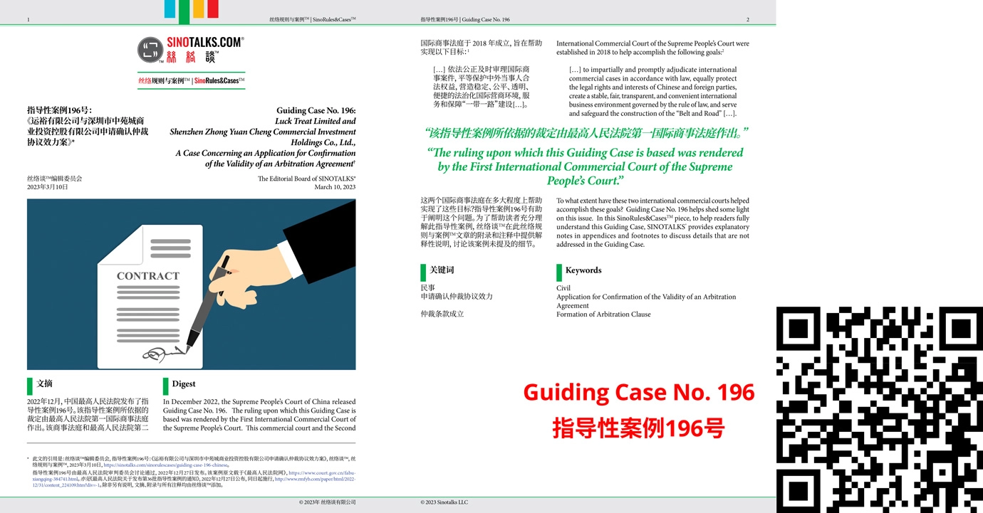 指导性案例196号(《运裕有限公司与深圳市中苑城商业投资控股有限公司申请确认仲裁协议效力案》)涉及带有仲裁条款的合同。1   法院采取了自由宽松的态度,认定合同未能成立并不影响该仲裁条款的成立,因为该仲裁条款的内容已得到当事人的一致同意。由于仲裁被普遍认为是解决复杂跨境事务引起的法律纠纷的一种高效率且有效的方法,跨境交易的外国当事人可能会欣赏中国司法机构对仲裁的大力支持。