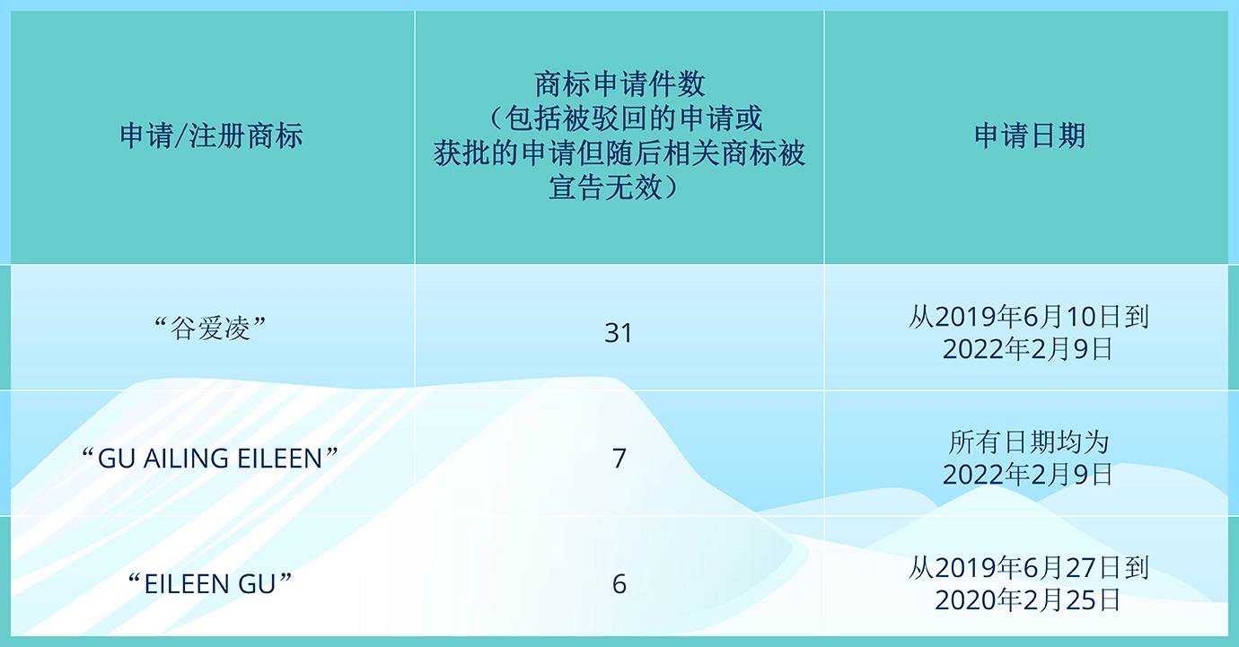 除上述三个名称外,其他商标申请中还使用了许多其他同音词或相关的名称变化,以唤起与滑雪运动员Eileen Gu的联系。