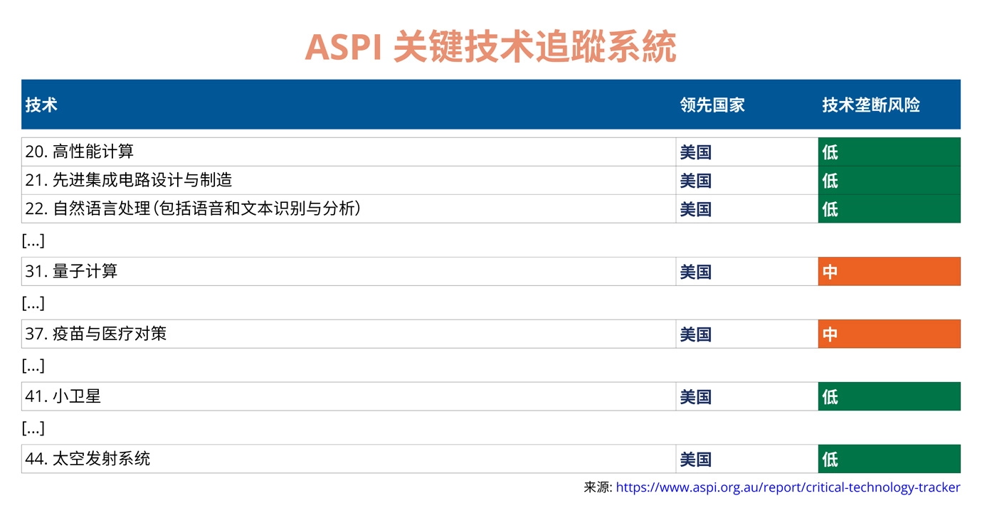 根据澳大利亚战略政策研究所(Australian Strategic Policy Institute;“ASPI”)的研究,在该研究所追踪的44项技术中,中国在其中37项技术上确立了领先地位。这37项技术包括八项“能源与环境”技术(例如:“超级电容器”、“核废料管理与回收”、“生物燃料”等)以及其他涵盖“人工智能、计算与通信”、“生物技术、基因技术和疫苗”和“国防、太空、机器人和交通” 等领域的技术。