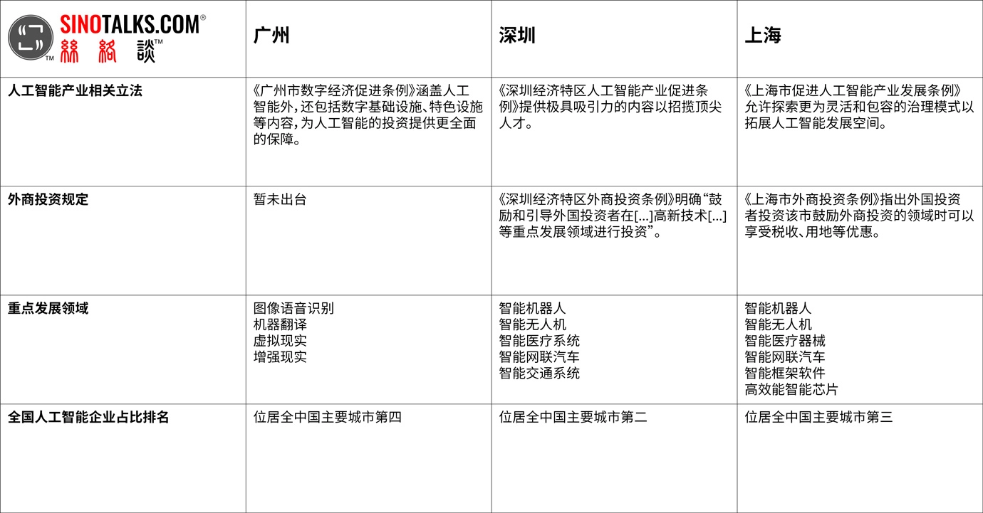 通过上述的条例及下文讨论的外资支持政策等,广州、深圳、上海积极展示其人工智能产业发展的特色,以吸引外资壮大其在此日益重要领域所作出的努力。