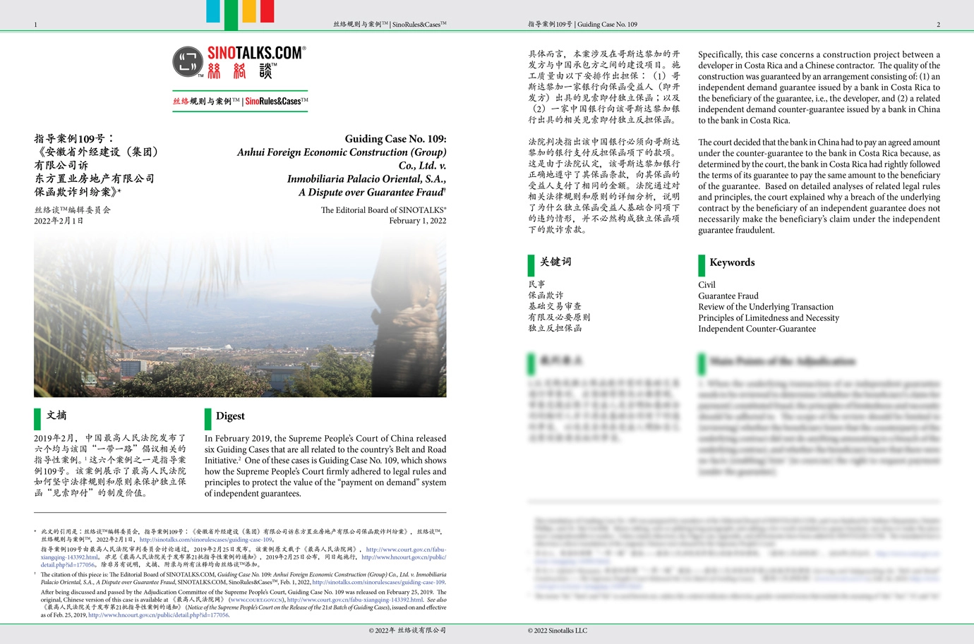 2019年2月,中国最高人民法院发布了六个均与该国“一带一路”倡议相关的指导性案例。这六个案例之一是指导案例109号。该案例展示了最高人民法院如何坚守法律规则和原则来保护独立保函“见索即付”的制度价值。