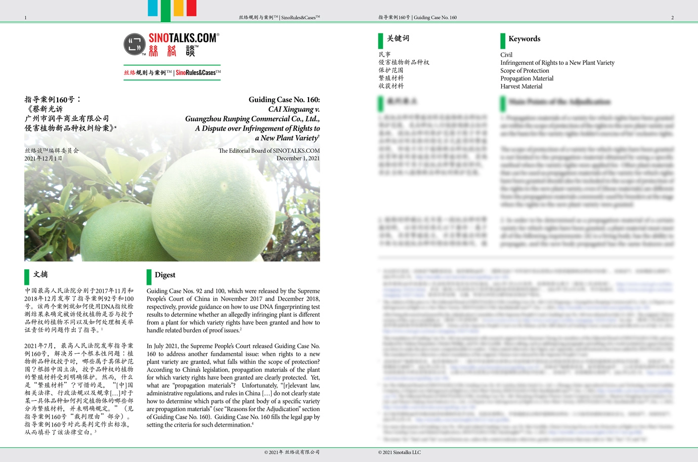 † 此文的引用是:丝络谈™编辑委员会,指导案例160号:《蔡新光诉广州市润平商业有限公司侵害植物新品种权纠纷案》,丝络谈™,丝络灼见™,2021年12月1日,https://zh.sinotalks.com/sinoinsights/guiding-case-160。指导案例160号由最高人民法院审判委员会讨论通过,2021年7月23日发布。除非另有说明,文摘、附录与所有注释均由丝络谈TM添加。