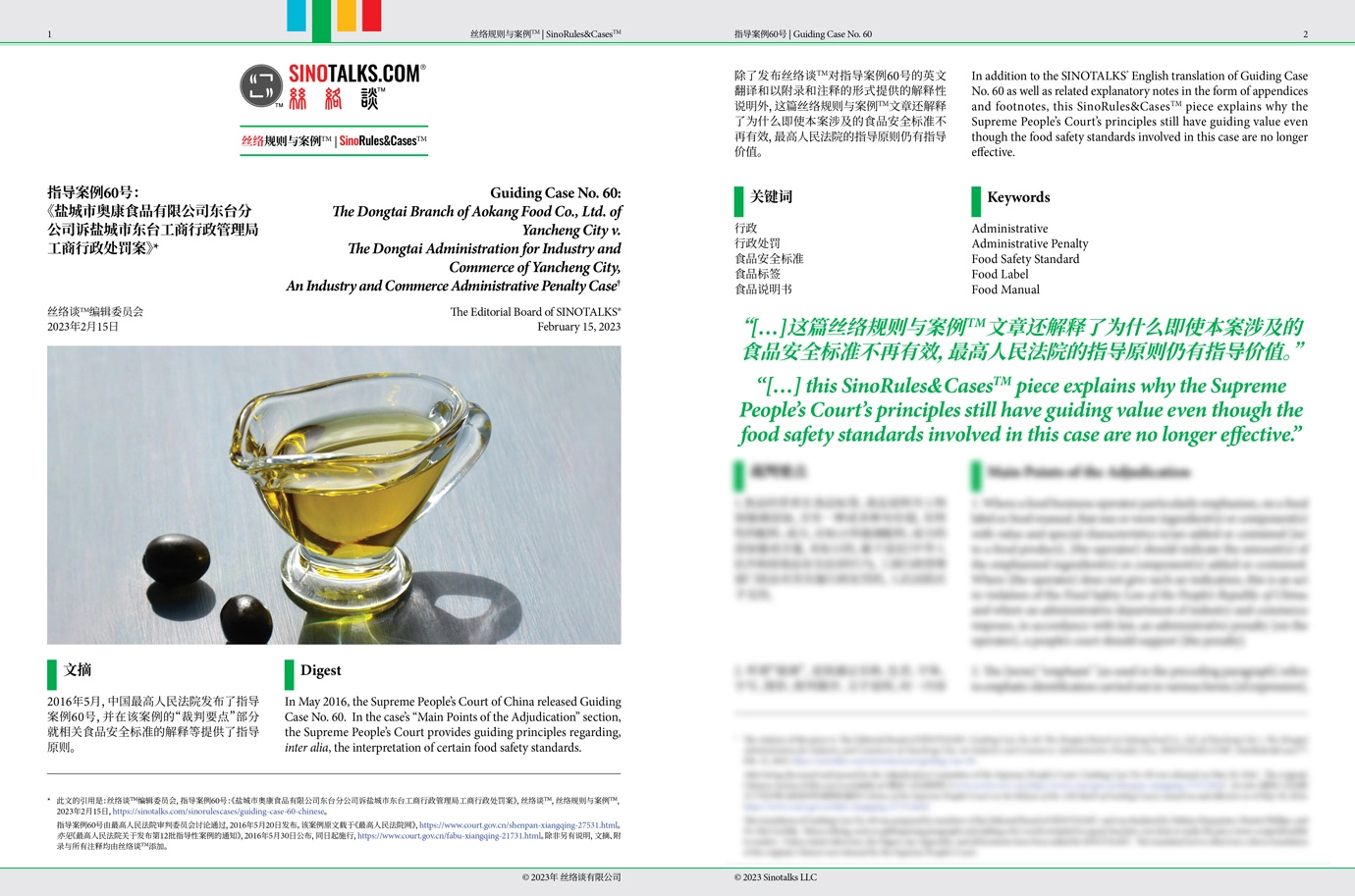 除了发布丝络谈™对指导案例60号的英文翻译和以附录和注释的形式提供的解释性说明外,这篇文章还解释了为什么即使本案涉及的食品安全标准不再有效,最高人民法院的指导原则仍有指导价值。