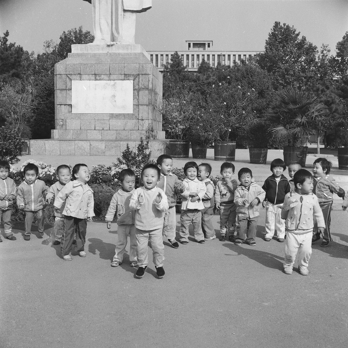 受访者注:这张照片摄于1986年7月,也就是《中华人民共和国义务教育法》生效的那个月。它描绘了一群幼稚园的孩子在毛泽东的大理石雕像脚下“排队”上学的情景。